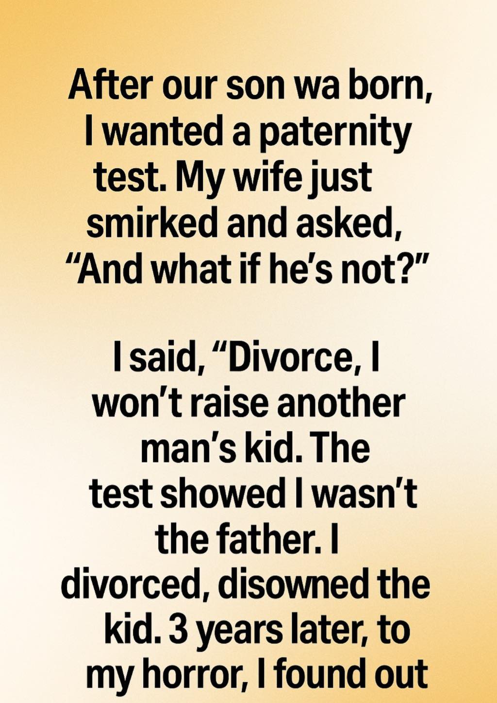 After our son was born, I demanded a paternity test. My wife just looked at me with this unreadable expression—not quite a smile, more like a smirk—and asked quietly, “And what if he’s not yours?” I remember feeling my jaw tighten, my voice coming out cold and hard. “Then divorce. Simple as that. I won’t raise another man’s child.” The test came back, and the results were clear: I wasn’t the father. I filed for divorce within a week. I walked away from both of them without looking back, convinced I’d been betrayed, convinced I’d done the right thing by protecting myself from deception.