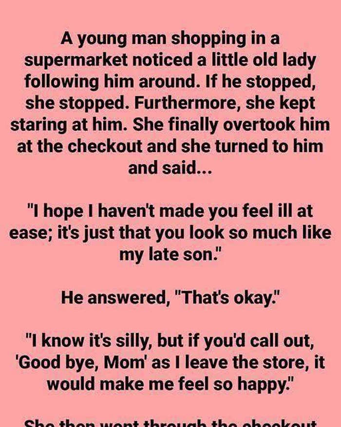 A young man noticed an elderly lady following him around while shopping in a supermarket. She stopped when he stopped and kept staring at him. Eventually, at the checkout, she approached him and said, “I hope I haven’t made you feel ill at ease; it’s just that you look so much like my late son.”