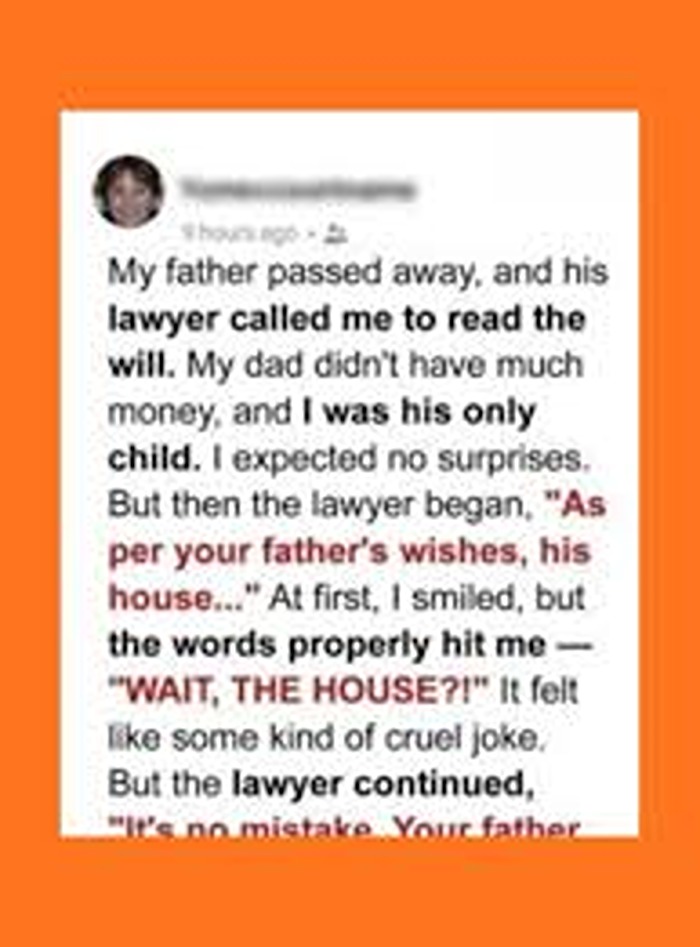 My father passed away, and his lawyer called me to read the will. My dad didn’t have much money, and I was his only child. I expected no surprises. But then the lawyer began, “As per your father’s wishes, his house…” At first, I smiled, but the words properly hit me — WAIT, THE HOUSE?! I never imagined there was anything valuable left behind, let alone something so meaningful.