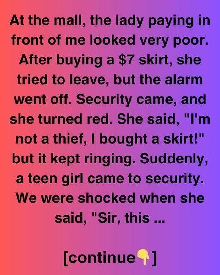 I was waiting in line at the mall when the woman in front of me finally paid for her $7 skirt and turned to leave—only for the security alarm to blare. She blushed furiously and protested, “I’m not stealing—I bought it!” The guards closed in, and she sank, mortified.