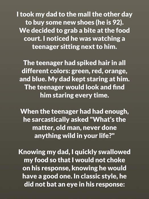 Last weekend, I took my 92-year-old dad to the mall to buy him a new pair of shoes. After we finished shopping, we headed to the food court for a quick meal and found a spot next to a teenager whose hair was styled into bright, spiked colors. Vivid shades of green, red, orange, and blue stood straight up like a painted sunrise.