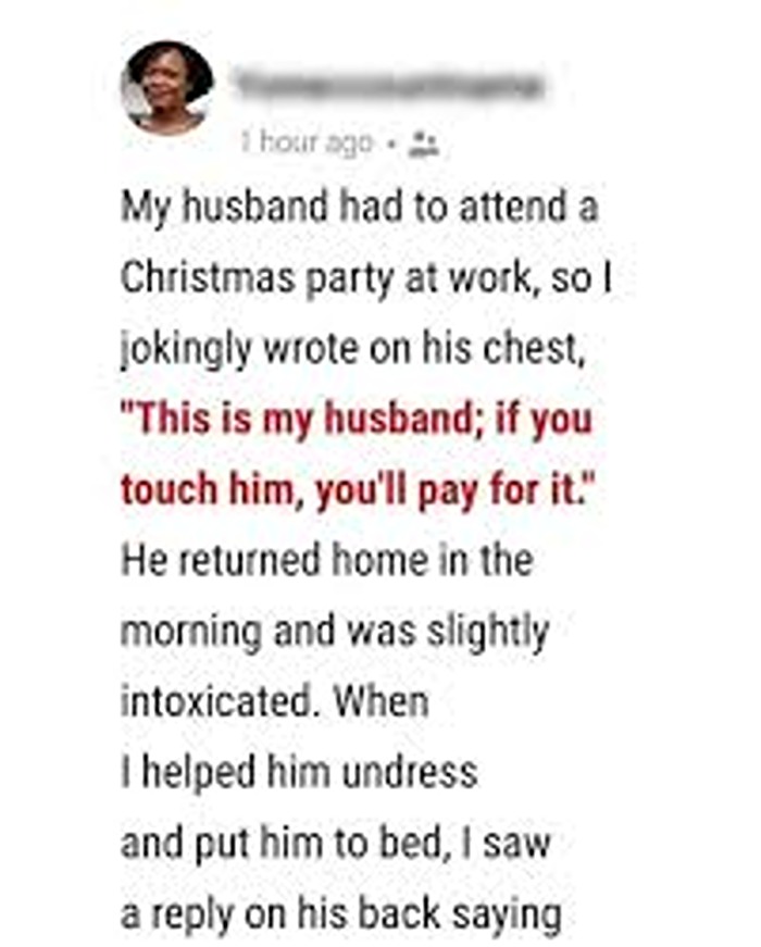 “So, you’re the woman who wrote a reply on my husband’s chest?” I asked her.