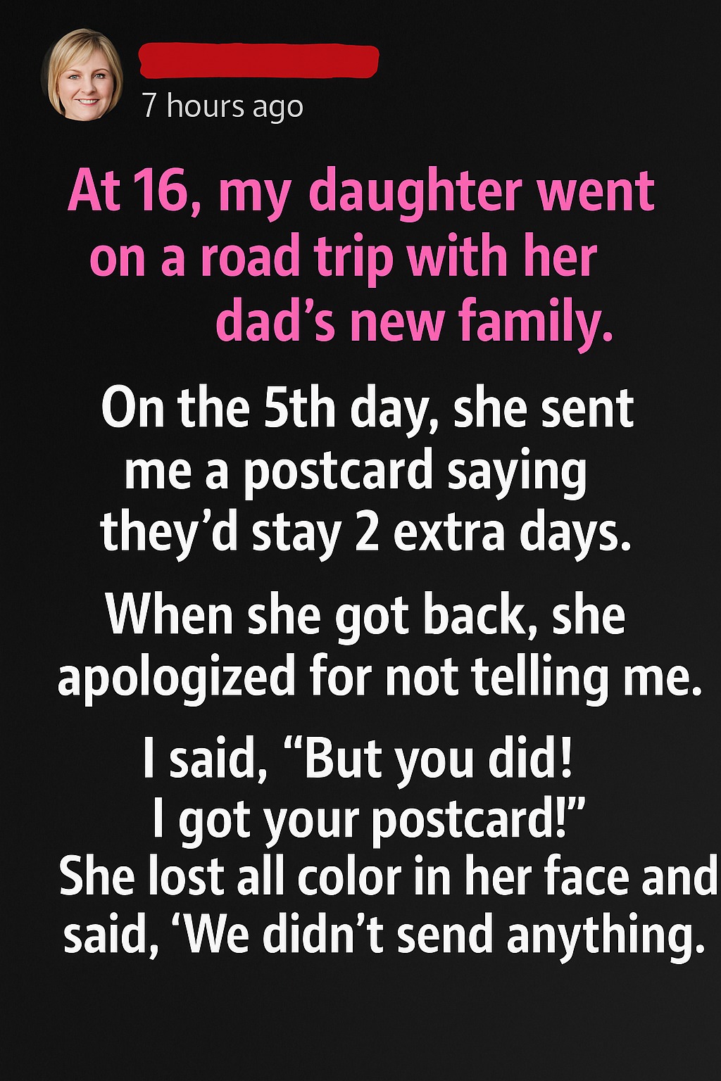 When my 16-year-old daughter went on a road trip with her dad’s new family, she sent me a postcard on day five saying they’d be staying two extra days. When she got home, she apologized for not telling me. I said, “But you did—you sent me a postcard.” Her face went pale. “Mom… we didn’t send anything.” We sat in silence, both unsettled. I grabbed the postcard from the drawer. The handwriting looked like hers—at least, that’s what I thought. She studied it, her hands trembling. “This isn’t mine.”