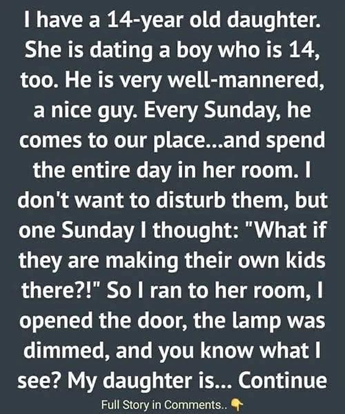 Every Sunday, he visits, and the two of them spend hours in her room. I remind myself they’re just hanging out, but when the giggles get quieter and the door stays firmly shut, my imagination starts to wande