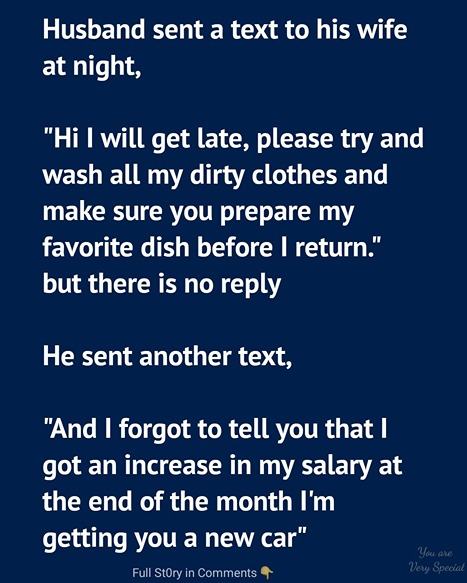 Late one night, a husband texted his wife, asking her to wash his dirty clothes and cook his favorite meal before he got home. When she didn’t reply, he sent another message saying his salary had gone up and he was planning to buy her a new car. Excited, his wife quickly replied, “Really?” He then said, “No, I just wanted to check if you saw my first message.” His clever response added a funny twist to their chat.