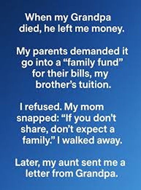 When my Grandpa passed on, he left me money. My parents insisted it should go into a “family fund” for their household expenses and my brother’s tuition. I chose not to agree, and my mom reacted with frustration, telling me that I wasn’t being supportive. Feeling overwhelmed, I stepped away from the conversation. Later, my aunt sent me a letter from Grandpa. At first, I couldn’t bring myself to open it. The disagreement with my parents was still fresh, and their words replayed in my mind. I had always tried to be considerate, helpful, and respectful, but something about this inheritance felt personal—like a final message filled with intention. When I finally opened the letter, I expected a simple explanation. Instead, it felt like a heartfelt conversation from someone who had understood me deeply.