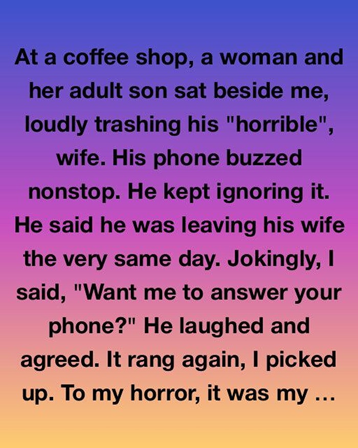 At a coffee shop, I overheard a man and his mother tearing into his “horrible” wife. His phone kept buzzing, and when I jokingly offered to answer, he agreed. To my shock, it was my sister on the other end.