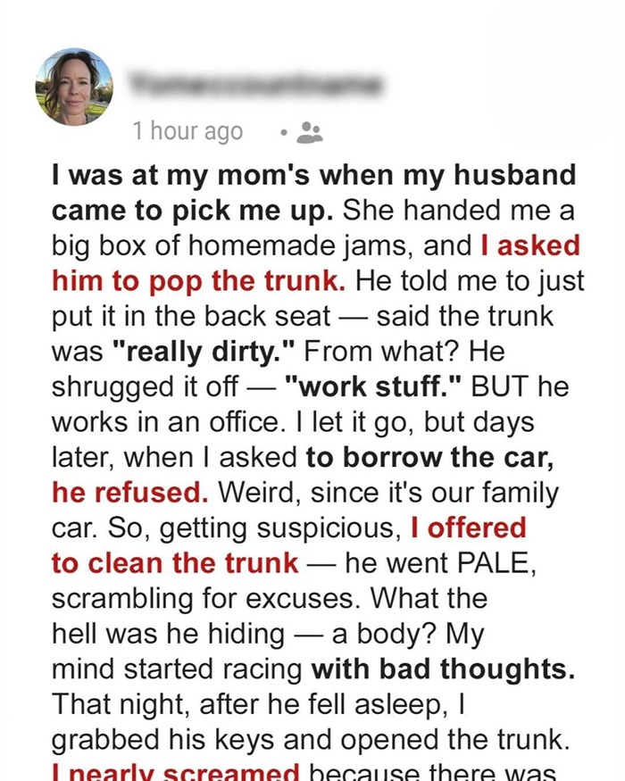 When Celia noticed her husband Adam becoming oddly protective of their car’s trunk, a quiet alarm sounded in her mind. What began as an ordinary afternoon a ride home from visiting her mother and a casual request to open the trunk took a suspicious turn when Adam insisted it was “dirty with cement” and avoided opening it. Over the following days, his strange behavior only fueled her anxiety.