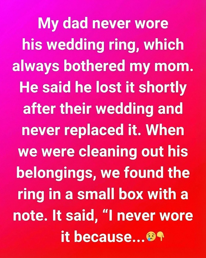 My dad never wore his wedding ring, which always bothered my mom. He said he lost it shortly after their wedding and never replaced it. When we were cleaning out his belongings, we found the ring in a small box with a note.
