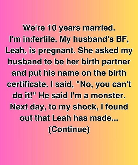 I’m infertile. My husband’s best friend, Leah, is pregnant. She asked my husband to be her birth partner and put his name on the birth certificate.I said, “No, you can’t do it!” He said I’m a monster.