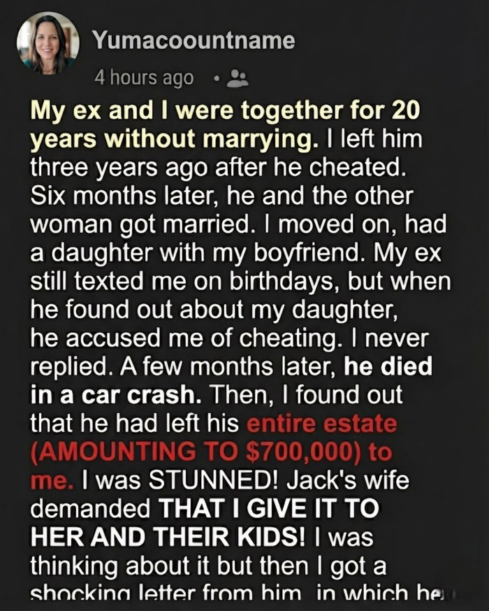 What shocked me even more was what happened after: he left everything he owned to me—almost $700,000. His wife and children weren’t included at all. His widow immediately demanded that I give all the money to her.