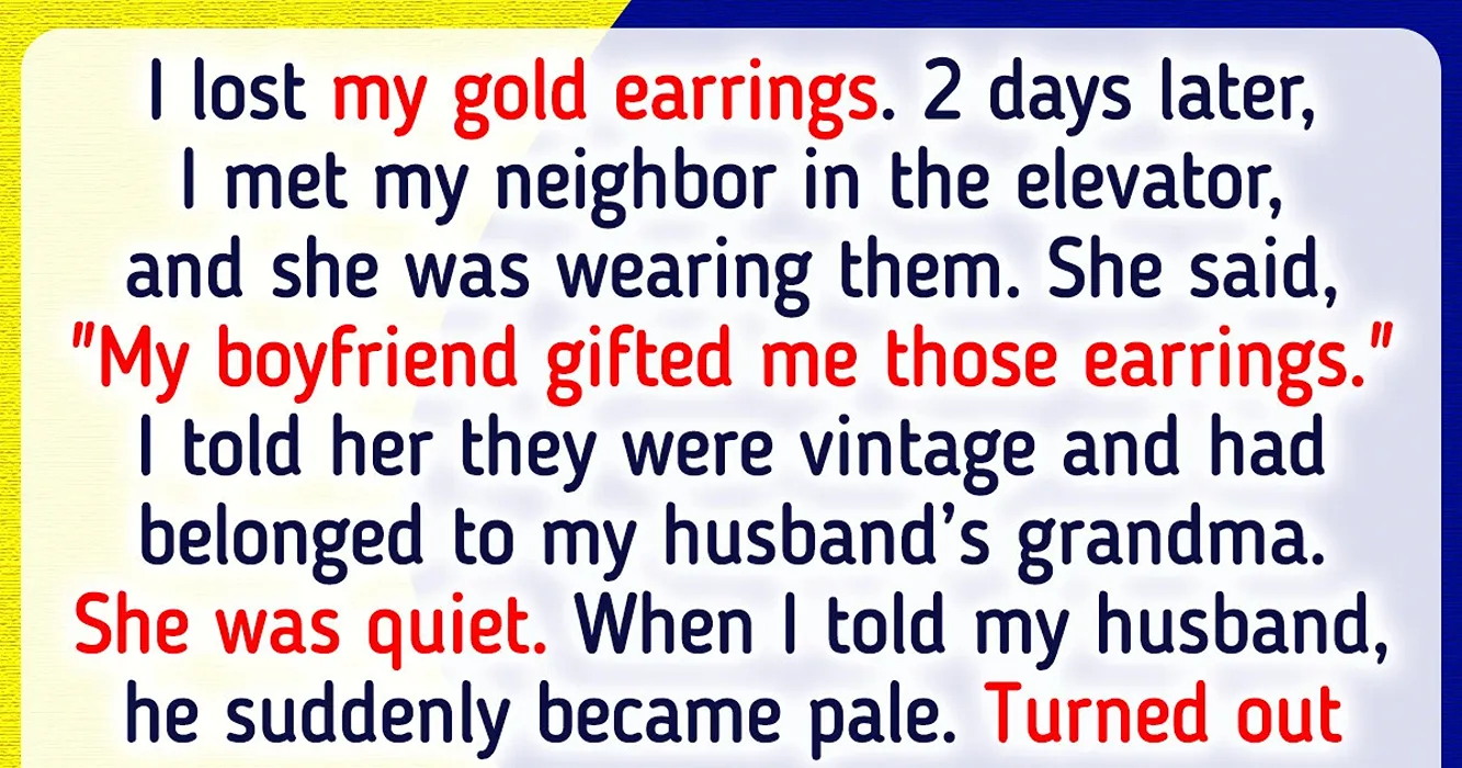 - I lost my gold earrings. 2 days later, I met my neighbor in the elevator, and she was wearing them. She said, "My boyfriend gifted me those earrings." I told her they were vintage and had belonged to my husband’s grandma. She was quiet for a while, but then she smirked and said, "Then, it’s time for you to have a serious talk with your husband."