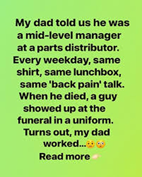 My dad always told us he was a mid-level manager at a parts distributor. Every weekday looked the same—same shirt, same lunchbox, same stories about “back pain from the office.” We never questioned it. But at his funeral, a man in uniform approached us, and everything we thought we knew shifted. He revealed that Dad wasn’t a manager at all—he was a maintenance worker who kept an entire facility running. “Your father saved our day more times than I can count,” the man said. “He never wanted credit, but he deserved it.”