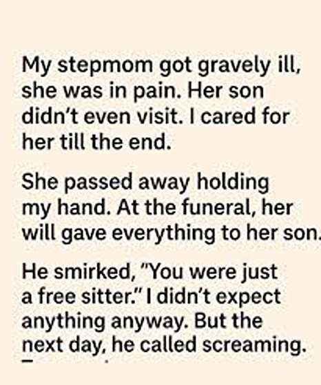 I didn’t expect anything anyway. But the next day, he called me, yelling in confusion and anger. He had found a letter tucked inside one of the old boxes his mother left behind. It wasn’t addressed to him—it was addressed to me. In it, she thanked me for caring for her with patience and kindness during her most vulnerable days. She wrote that while she couldn’t change her will without causing more conflict, she hoped her words would remind me that what I gave her mattered far more than anything she could leave behind.