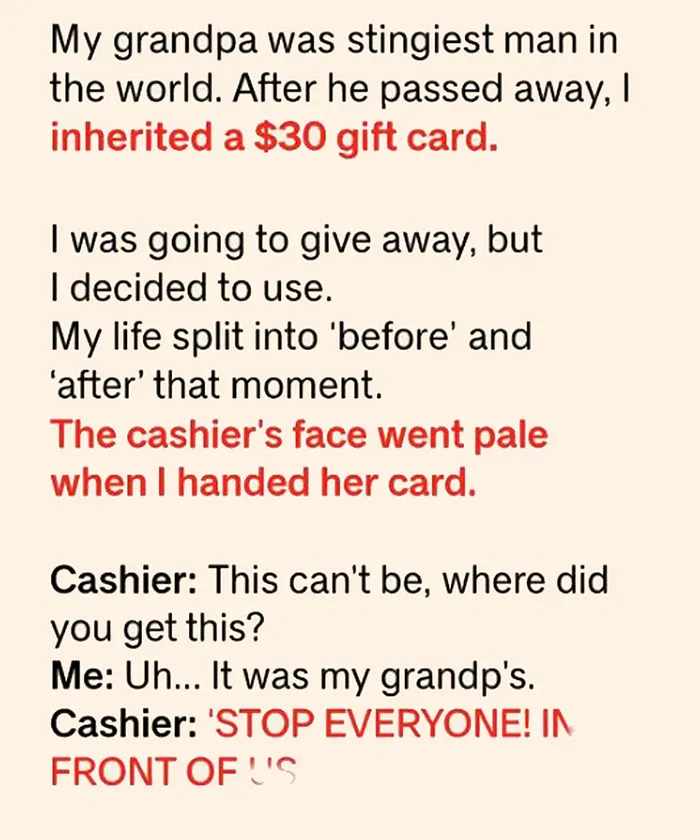 My grandpa was stingiest man in the world. After he passed away, I inherited a $30 gift card.