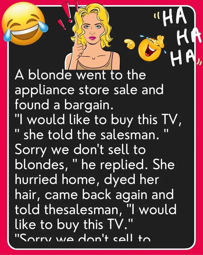 ”I would like to buy this TV, ” she told the salesman. ” Sorry we don’t sell to blondes, ” he replied.