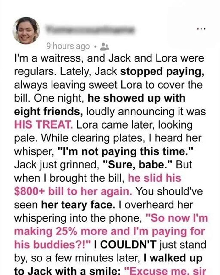 I’ve been a waitress at a fancy downtown restaurant for ten years, but nothing shocked me like the night Jack strutted in with eight rowdy friends and expected his wife, Lora, to cover their $800+ bill. They used to be a sweet couple. Now, Jack indulged in lavish meals, and Lora paid every time, her face more strained each visit.