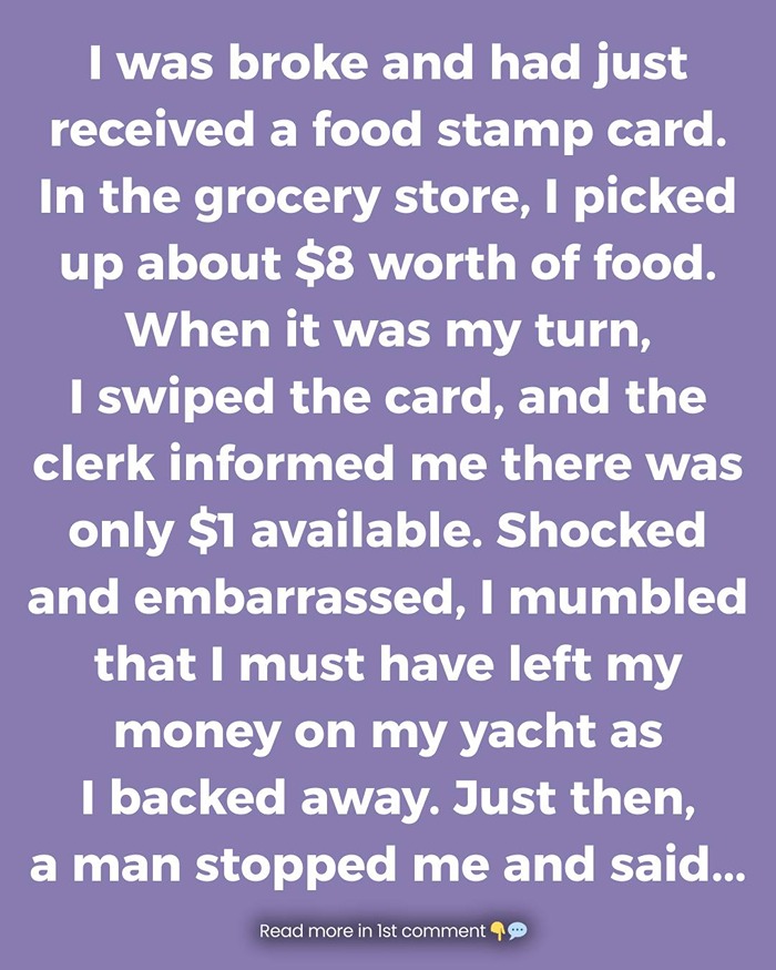 I walked into the grocery store that day feeling defeated, carrying the weight of bills, uncertainty, and a food stamp card I had never imagined myself needing. I picked up about eight dollars’ worth of basics—just enough to get me through the week—and tried to keep my head down as I approached the register. But the moment I swiped the card, everything unraveled. “There’s only one dollar available,” the clerk said. My stomach dropped. Heat rushed to my face. Trying to mask my humiliation, I joked that I must have “left my money on my yacht” as I slowly backed away from the counter, ready to abandon the groceries and flee the moment.