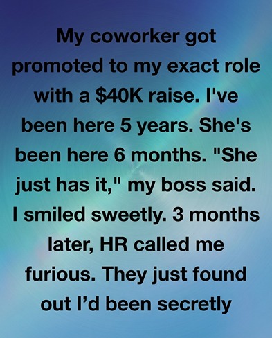 I thought I was immune to corporate surprises after five years at the same company—until one cheerful announcement flipped everything upside down. My manager gathered the team and proudly revealed that a colleague had been promoted into my role, complete with the same responsibilities and a salary increase that dwarfed every raise I’d earned combined. I smiled on the outside, but inside something sharpened. It wasn’t anger or jealousy. It was clarity. In that moment, I realized I hadn’t been valued for my work—I’d been relied on for my silence.