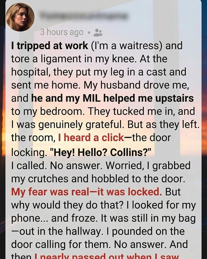 I tripped at work (I’m a waitress) and tore a ligament in my knee. At the hospital, they put my leg in a cast and sent me home. My husband drove me, and he and my MIL helped me upstairs to my bedroom. They tucked me in, and I was genuinely grateful. But as they left the room, I heard a click—the door locking. “Hey! Hello? Collins?” I called. No answer. Worried, I grabbed my crutches and hobbled to the door. My fear was real—it was locked. But why would they do that? I looked for my phone… and froze. It was still in my bag—out in the hallway. I knocked lightly, trying not to sound panicked, but the house remained quiet, as though everyone had melted into the walls.