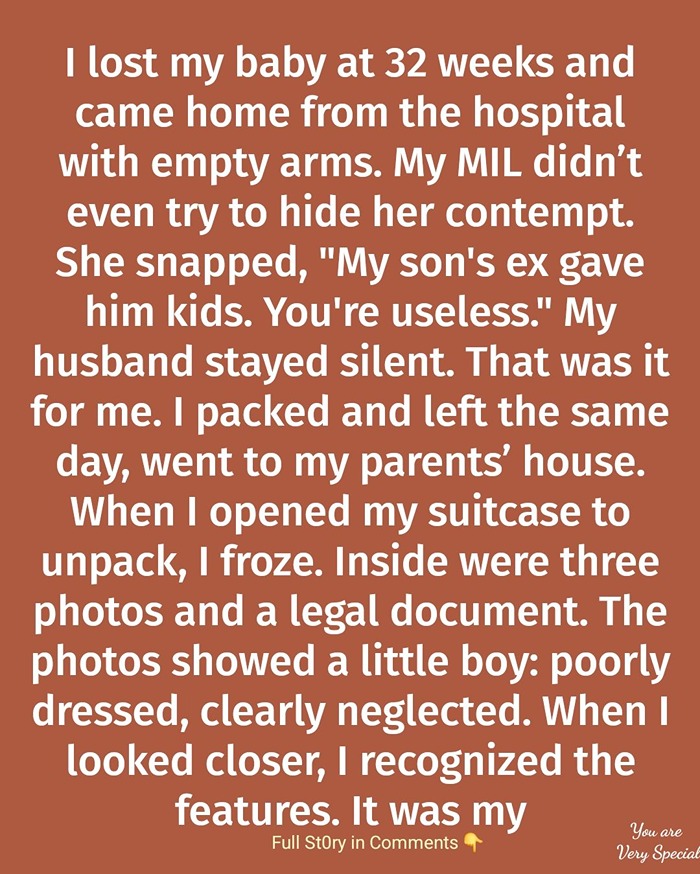 At the bottom of my suitcase were three photos and a legal paper I knew I hadn’t packed. The pictures showed a young boy—skinny, poorly dressed, with eyes that looked too old for his age. In one photo, he stood barefoot on a broken sidewalk. In another, he slept curled up against a wall, his ribs showing.