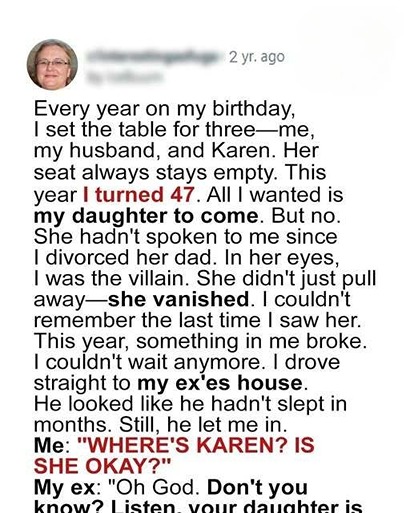 “Mom, I know I hurt you. I’m sorry for how things ended. I miss you. I think about you every day. Please come find me. I’m in Canada now — here’s my address. I love you. — Karen.”