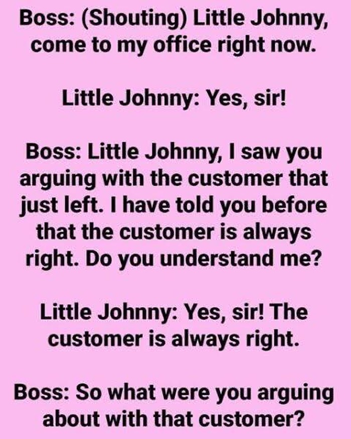 Boss: (Shouting) Little Johnny, come to my office immediately.Little Johnny: Yes, sir! Boss: Little Johnny, I noticed you arguing with the customer who just left. I’ve told you before that the customer is always right.