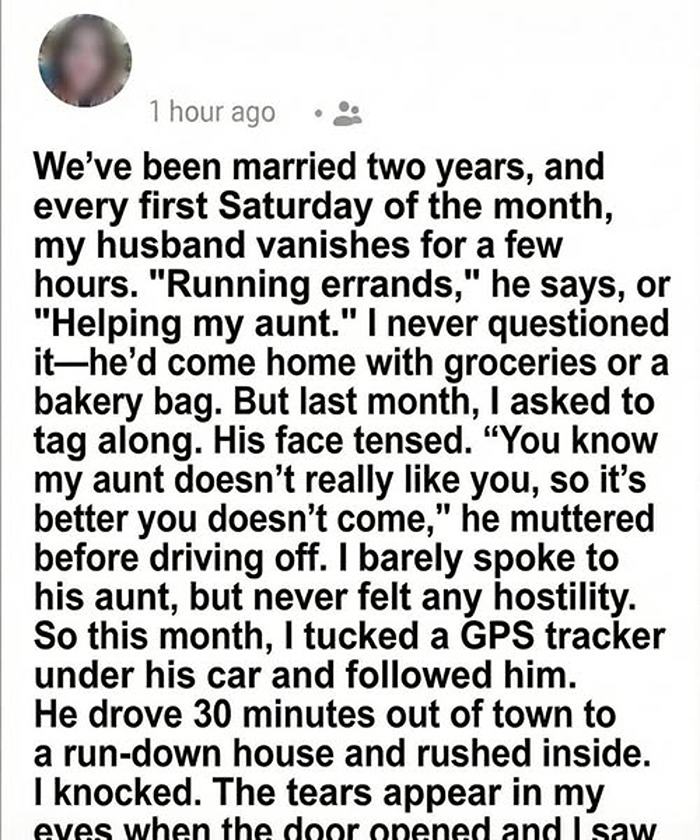 There was only one small detail that didn’t quite fit, though at the time it seemed insignificant. On the first Saturday of every month, without fail, my husband would leave the house mid-morning and be gone for several hours. He never made a big deal out of it. Sometimes he said he had errands to run. Other times, he mentioned stopping by to help a relative. He always returned with something tangible—bags of groceries, pastries from a bakery, or a small household item we supposedly needed.