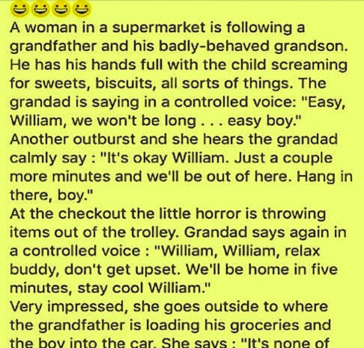 A woman in a supermarket is following a grandfather and his badly behaved grandson. He has his hands full with the child screaming for sweets, biscuits, all sorts of things. The grandad is saying in a controlled voice: “Easy, William, we won’t be long… easy boy.” Another outburst and she hears the grandad calmly say: “It’s okay William.