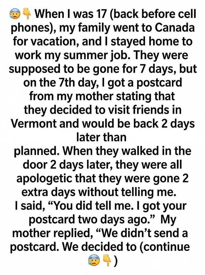 I was seventeen, old enough to taste freedom but still young enough to fear the quiet. The summer my family left for Canada without me, our house felt larger than it ever had—rooms echoing, clocks ticking too loudly, and nights stretching thin. They were supposed to be gone seven days. I worked mornings at a grocery store, came home to microwave dinners, and slept with the radio on for company. On the seventh day, a postcard arrived. It was addressed in my mother’s handwriting,…..CONTINUE READING BELOW