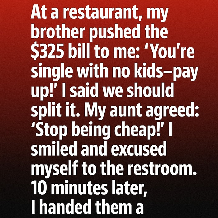 Dinner had started off light and cheerful — jokes flying, glasses clinking, the kind of laughter that fills a restaurant. But when the check arrived, the mood shifted. My brother slid the $325 bill toward me with a grin. “You’re single with no kids—come on, you can cover it,” he said, as if it were the most natural thing in the world. My aunt chimed in with a teasing, “Stop being cheap!” and a few others laughed. I smiled, not because it was funny, but because I suddenly understood something. Without arguing, I excused myself and walked to the restroom. Ten minutes later, I came back holding the receipt — the bill was paid in full. Their smiles faded when I said quietly, “Don’t worry, it’s taken care of. Just remember how this felt next time someone’s treated unfairly.”