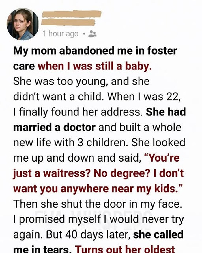 When I finally knocked on her door, I faced a reality I hadn’t anticipated. She looked at me as though I were an intruder in the life she had carefully constructed without me. She appeared confident, polished, and surrounded by the family she had built while I grew up elsewhere. I told her about my life, about the work I did to make ends meet, but she dismissed it with a cold, cutting remark: “You’re just a waitress. I don’t want you near my children.” Then she closed the door.