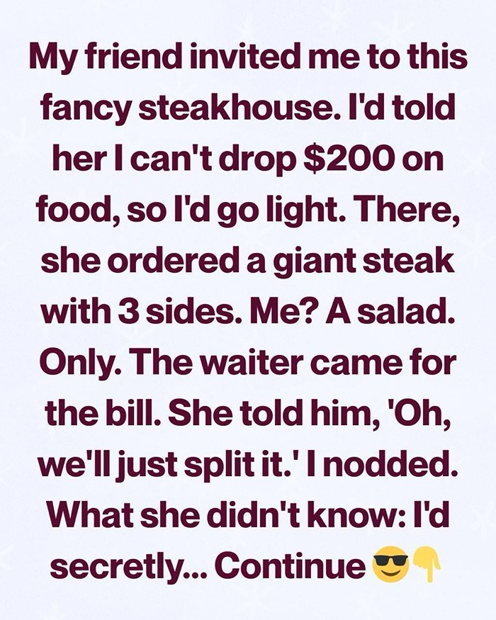 She chose one of the most expensive steaks on the menu, cooked exactly to her liking. Then came the sides. Truffle mashed potatoes. Creamed spinach. Grilled asparagus. One by one, they piled up. She finished by ordering a glass of wine, never once glancing at the price.