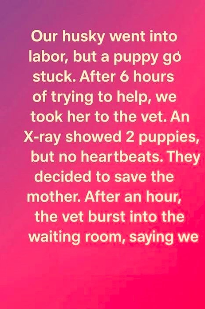Our husky went into labor, but a puppy got stuck. After six exhausting hours of trying to help, we realized we couldn’t do it alone. With heavy hearts, we rushed her to the nearest emergency vet clinic. The X-ray revealed two puppies inside, but there were no signs of a heartbeat. The vet gently explained that they needed to act fast to save our husky, Luna.