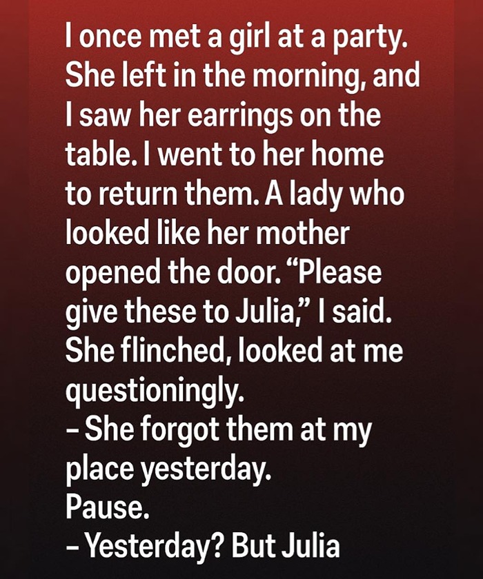 As we talked, the truth unfolded without urgency. Julia had once been exactly as I described—carefree, luminous, the kind of person who left fragments of herself behind wherever she went. Then one day she simply didn’t return. No dramatic farewell. No answers. Just absence.