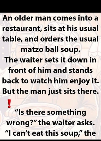 An older man comes into a restaurant, sits at his usual table, and orders the usual matzo ball soup.