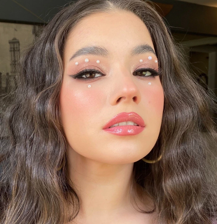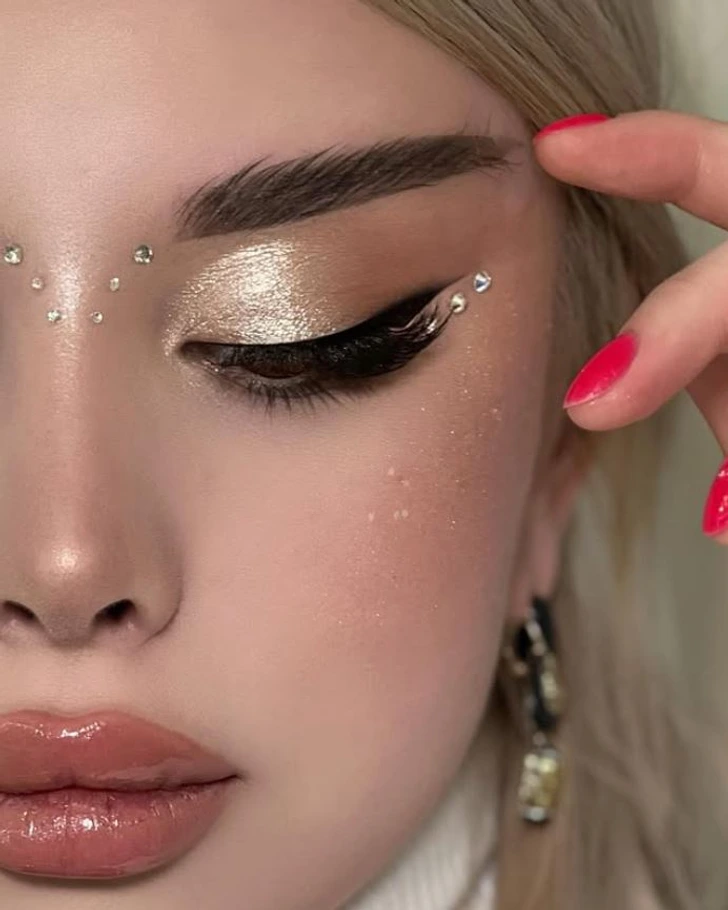 Actually, you can place embellishments even on the bridge of your nose. Look how they match a metallic accent on the eyelids. Silver and bronze shadows with glitter add expressiveness to the eyes.