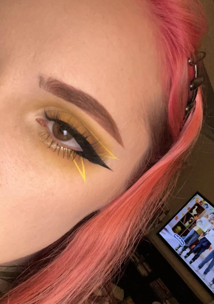Look at the girl on the right, she has this interesting metallic wing on top of the black line.
