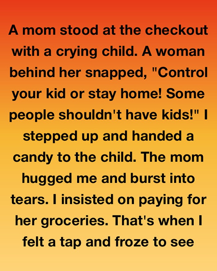 I reached into the impulse rack and grabbed a small strawberry candy, knelt slightly, and held it out. I made a ridiculous face—the kind that makes no sense but sometimes works. The boy hiccupped mid-scream, eyes locking onto the bright wrapper. The crying didn’t vanish instantly, but it paused. Just long enough.