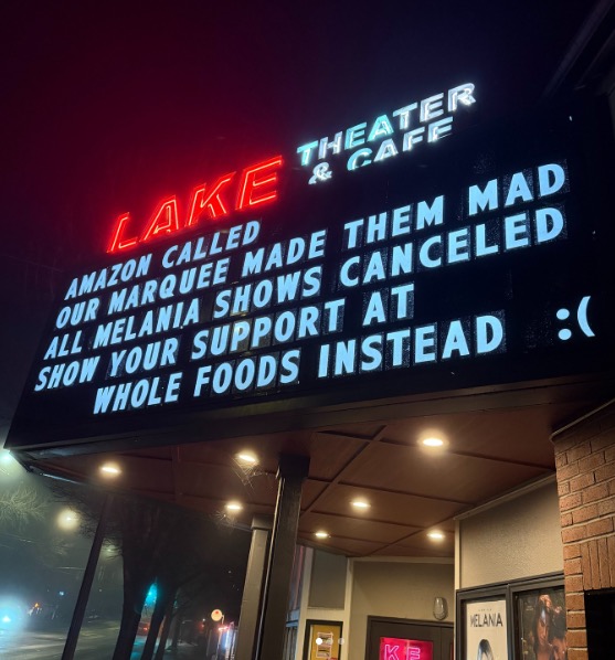 “Amazon called. Our marquee made them mad. All ‘Melania’ showings cancelled. Show your support at Whole Foods instead. Join Amazon Prime for Free Two-Day Shipping.”