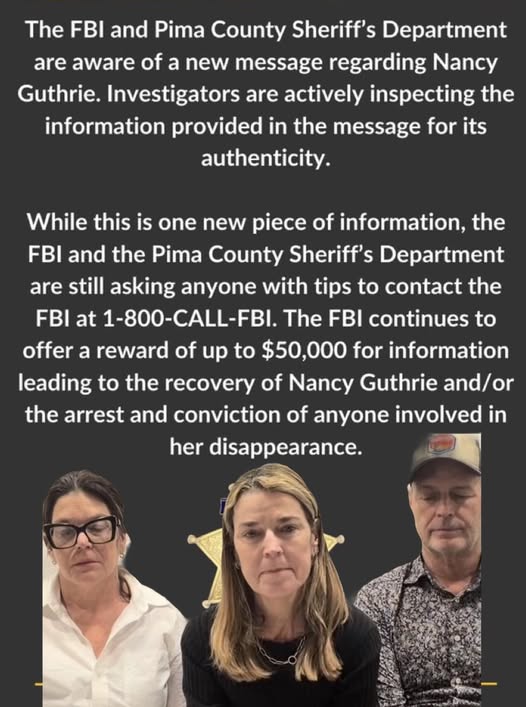 Nancy Guthrie was reported missing after disappearing from her home on January 31, 2026. Investigators believe she may have been taken against her will, though no suspects have been publicly identified. As national attention intensified, officials worked to balance public interest with the need to protect the integrity of the investigation. Complicating matters, a message claiming knowledge of Nancy’s disappearance was sent to a local news outlet and later shared with authorities. Investigators are examining the message cautiously, noting that similar communications can sometimes be attempts to mislead or gain attention during high-profile cases.