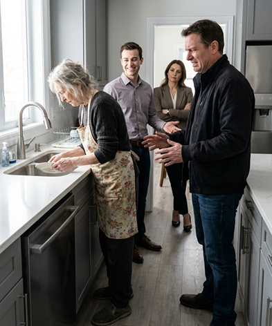 My mother stood hunched over the sink, wearing an old apron I remembered from childhood. Her shoulders looked sharp, fragile. Her once-careful hair hung in dull gray tangles. Her hands shook as she scrubbed a plate that was already clean.