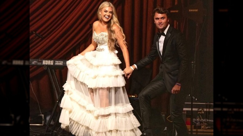 Erika Kirk has come far since her pageant days, but it seems her sense of fashion has struggled in the years since. This was evidenced by her promotional Instagram of Kirk onstage for Turning Point USA's Young Women's Leadership Summit in June 2021. While her messaging was about trusting the process, it seems that Kirk might have put too much trust in her styling. Here, her dress simply has too much going on; from the cutouts to the flared hem to the criss-crossed collar, it's chaos. Even with a short length to show off her gams, it's too much to take in.