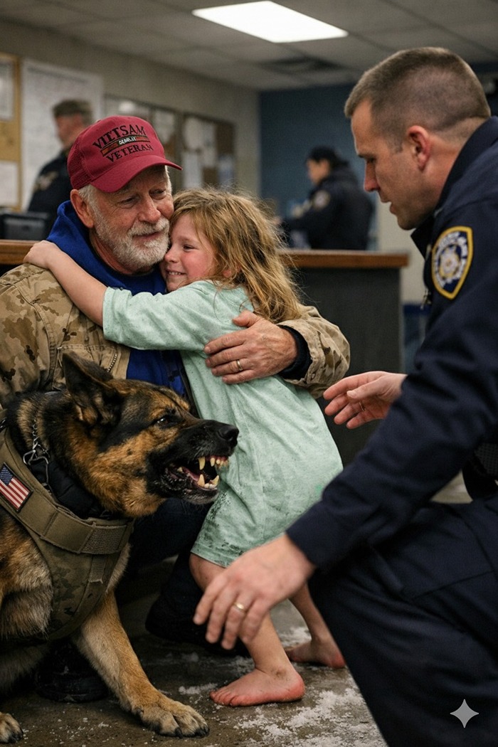 His body moved forward, placing itself between the child and the rest of the room, head lowered, shoulders squared, a deep, rolling growl vibrating from his chest like distant thunder warning of a storm already too close. Conversations died mid-word. A deputy near the printer slowly lowered the stack of papers in his hands. The desk sergeant froze, eyes flicking from the dog to the door.