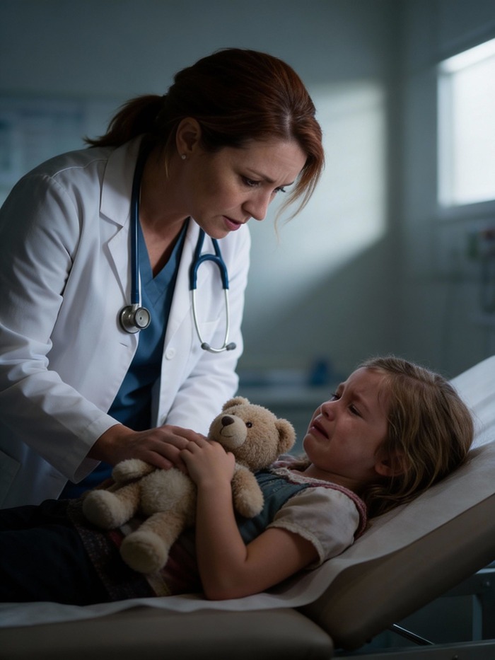 Maisie stood barefoot on cold wood, swallowed by an oversized T-shirt. She clutched a worn stuffed bunny with one floppy ear. Her cheeks were hollow, her stomach drawn tight beneath the fabric.