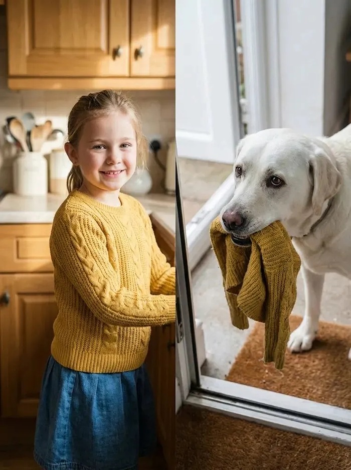 One morning, the stillness broke. Scratching sounded at the back door—urgent, insistent. Baxter, usually calm and obedient, stood there trembling, a small yellow sweater clutched carefully in his mouth. Erin recognized it immediately. Lily’s favorite. The sight caught her breath. Before she could take it, Baxter turned and ran, stopping only to look back and make sure she followed.