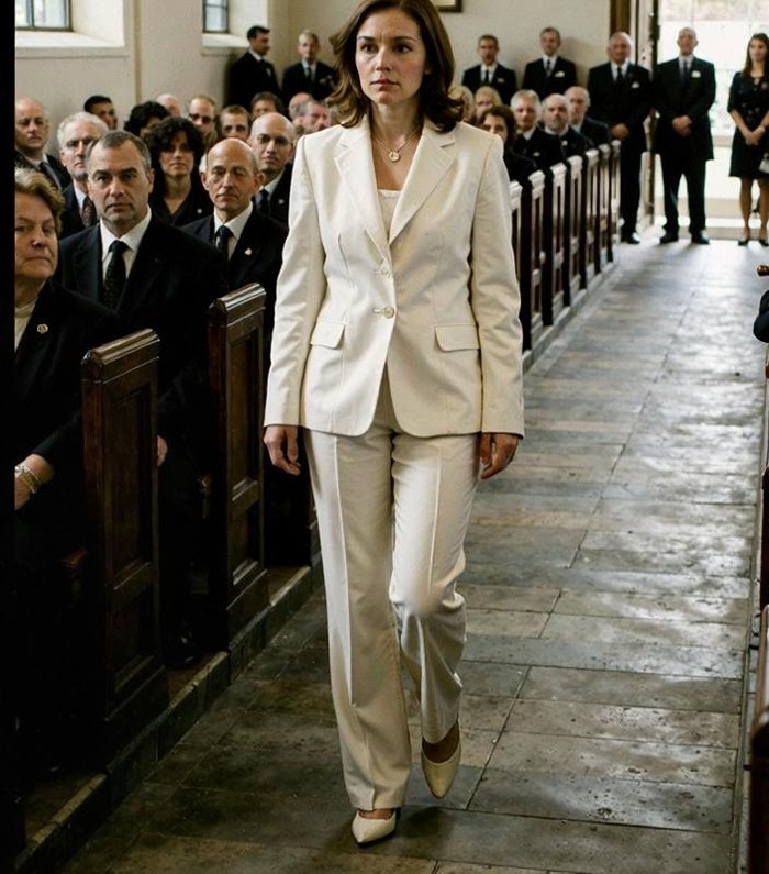 Elena walked down the center aisle. She was dressed entirely in white from head to toe.