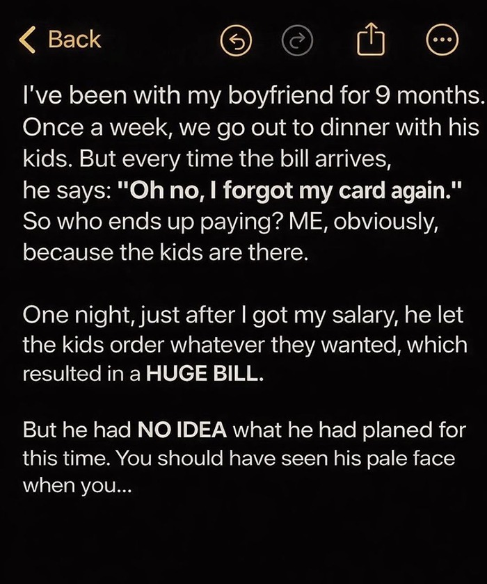 According to her post, her boyfriend’s kids loved going out to restaurants, so they made it a weekly habit. However, she noticed that almost every time, he somehow “forgot” his wallet at home.