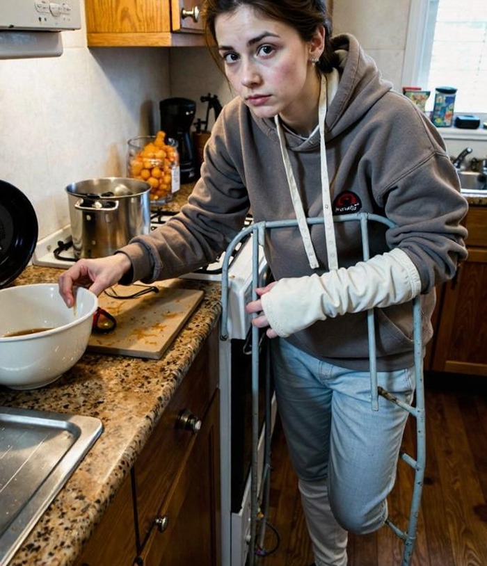 I stood there, gripping the railing with my good hand, trying not to cry. Each step looked impossible.