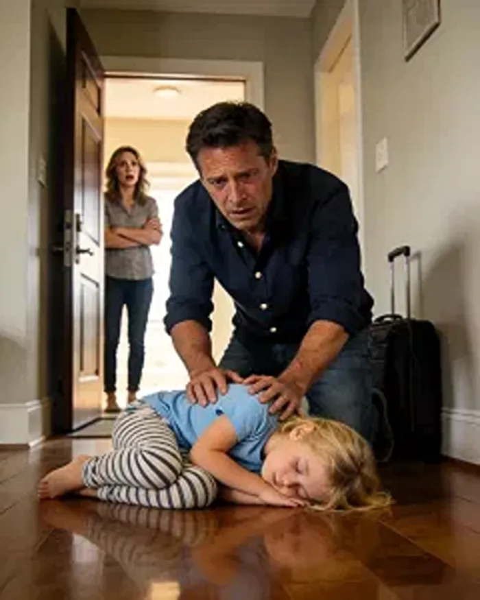 I dropped my suitcase and fell to my knees. My hands were shaking so badly I could barely touch her face. She was breathing—but barely. Then I saw the bruise clearly, fresh and unmistakable, and something inside me went cold.